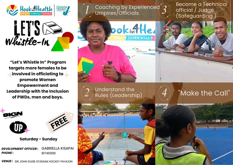 As can be seen in the photo above the Hin4H Team in Vanuatu have been developing female umpires within 6 village communities. These communities all have a Mamas in Hockey Program which is integrated sessions where the women are encouraged to be active through hockey, as well as having health and well-being discussions. To enable the women to continue playing safely together on days when the Hin4H Team are not present, volunteers were trained to be able to umpire their games. Since 2021 the program has provided international opportunity to 3 of these women to umpire at an Oceania event.